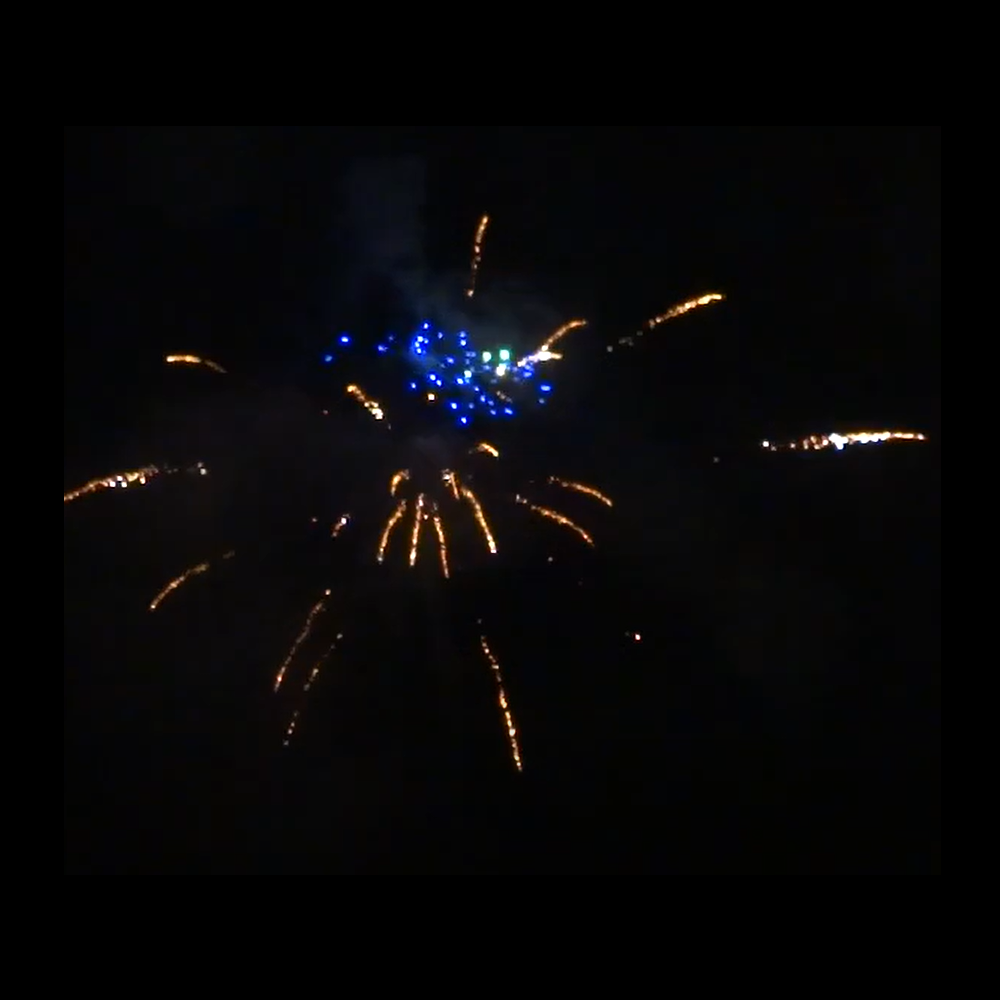 24 shots featuring blue and red strobe mines, tourbillions, multicolour falling leaves with blue stars, and a combination of brocade and crackling effects.