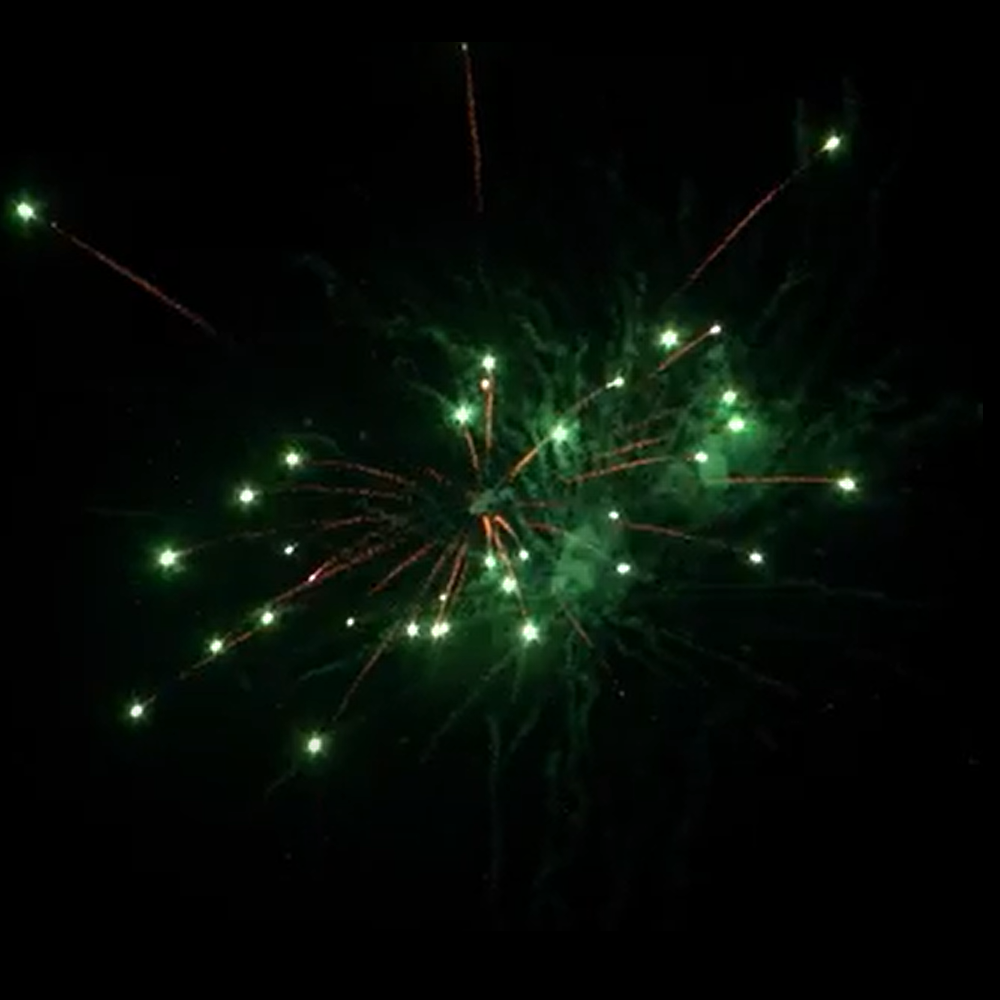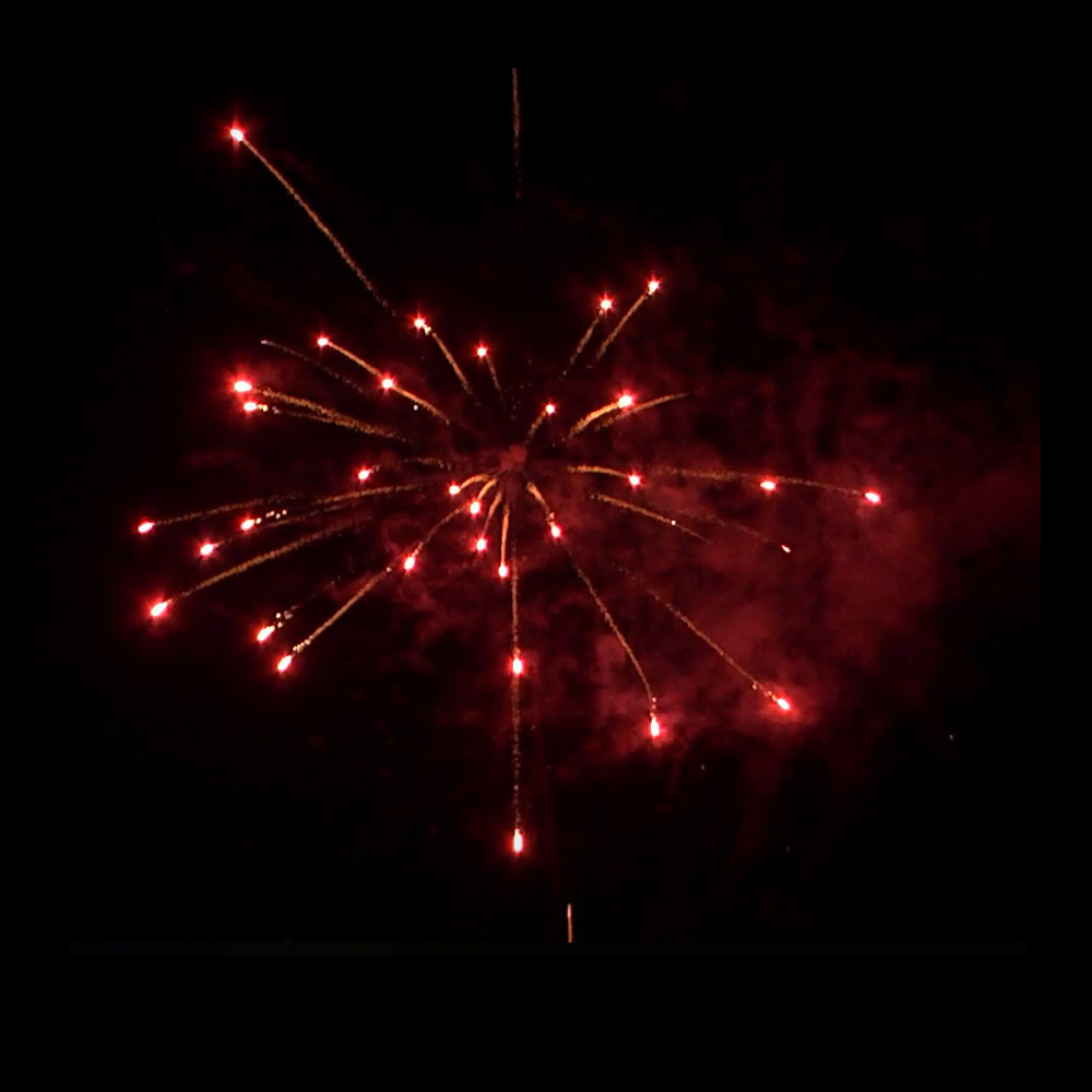 Gold tail to gold willows with red/green/crackling stars. Finale of gold tails to gold willow with crackling stars.